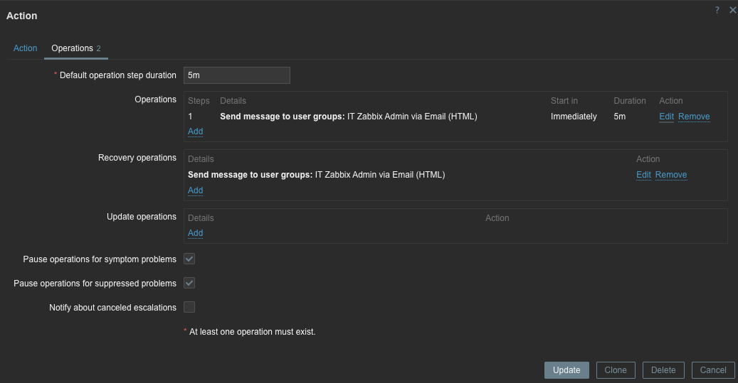 We have some flaky locations that go up/down within a couple minutes (I know, we have complained to the ISPs, but when they are the only one in town, they don't care). I want to delay sending an email about a location being down, unless it has been down for 5 minutes. I understand that is done by configuring the trigger actions for the email group. I created an email group named "Report issue to IT Admins", go into the Action for that group, then go to operations. At this point, I'm not sure what to. If I try to change the "Step Duration" on the default "Send Message", the emails still come through immediately. I also tried "Step 2", and while that delayed the "problem" email, an email still came through afterwards that the device was resolved. At this point, I stopped and realized I have no idea what I'm doing, so I am here asking.