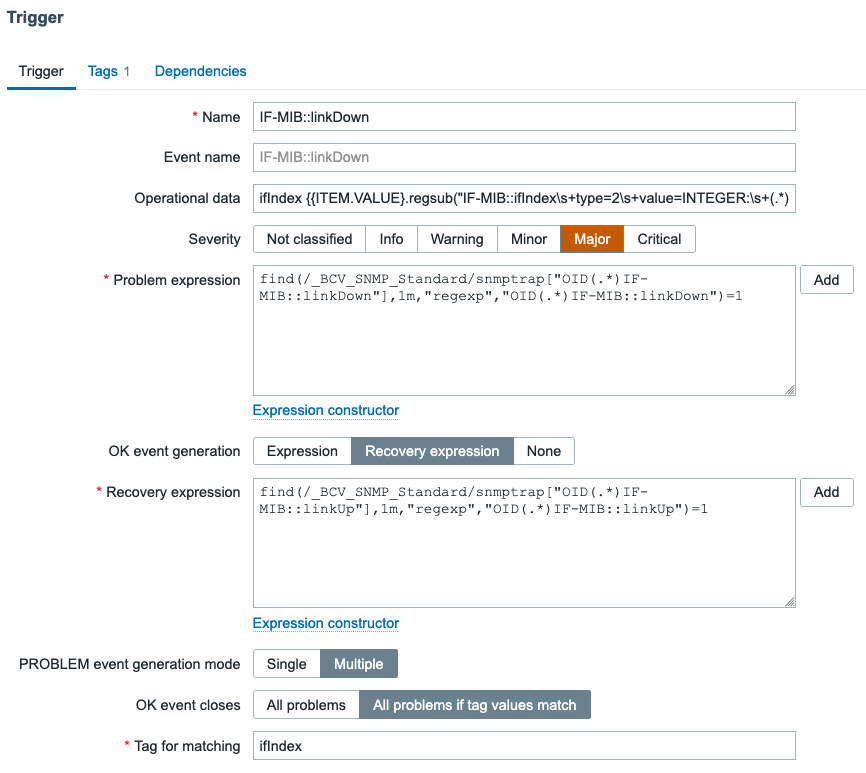 Just asking for assist as to what would cause Recovery Expression to not recognize event tags in Trigger Correlation. I do know the Problem Expression needs to be FALSE before the Recovery Expression can evaluate as TRUE. My thinking is if using the find() function that when a Recovery Expression is evaluated outisde the default 30 seconds then the Problem Expression will be FALSE. I am just at a loss as to why recovery does not recognize and close associated tag "ifIndex".