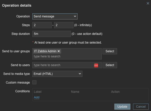 I'm trying to create a simple trigger that will wait 5 or 10 minutes when a problem occurs and if it is still an issue after that time, send me an email, if it gets resolved, disregard and don't send an email. I also want the reverse; wait 5 minutes before sending me an email that it is resolved, in case it goes down again. I want to reduce the noise I'm getting from Zabbix because out of the box, it is annoying and I can't tell what's actually a problem. I'm getting frustrated to no end. I've read through the documentation many times, but it's just not clicking with me. I've read other people ask about this very same thing, but either the answers are all different or really outdated and the options don't exist. Can anybody help?