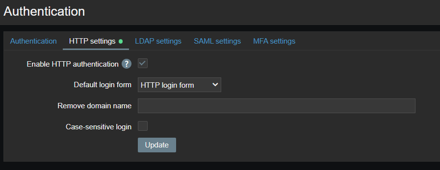 I'm trying to set up HTTP authentication with Zabbix, but I'm having trouble figuring out how to configure it correctly. I've looked through the documentation and searched online, but I didn't find anything use full.