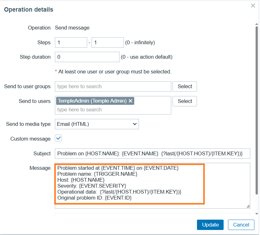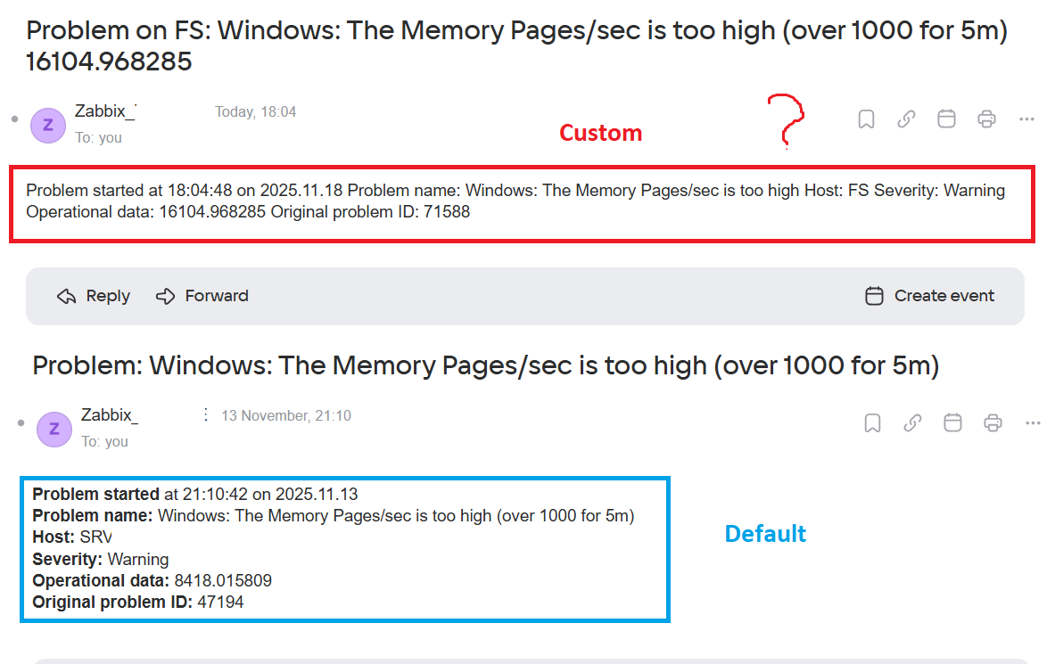 2. When you set a custom message, Zabbix sends exactly the HTML you wrote.
