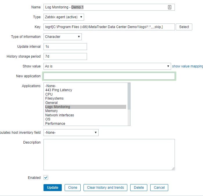 Adjust the setting according to the file name of the output log.Code:logrt[C:\Program Files (x86)\MetaTrader Data Center Demo1\logs\[0-9].*.*,,,,skip,] logrt[C:\Program Files (x86)\MetaTrader Data Center Demo1\logs\[0-9].*.log,,,,skip,]