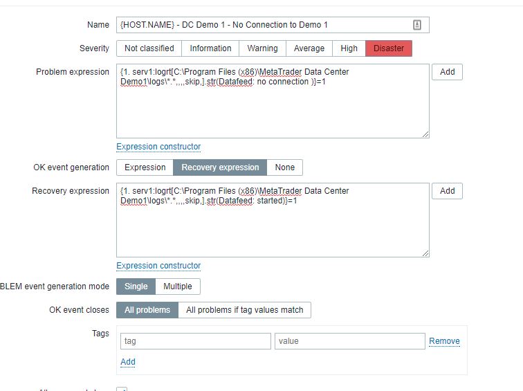 {Zabbix server:log["/opt/test.log","error text"].count(120,5)}>0 and {Zabbix server:log["/opt/test.log","error text"].nodata(3m)}=0Comment