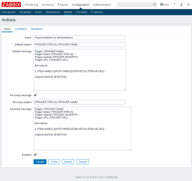 The e-mail sent by Zabbix contains: