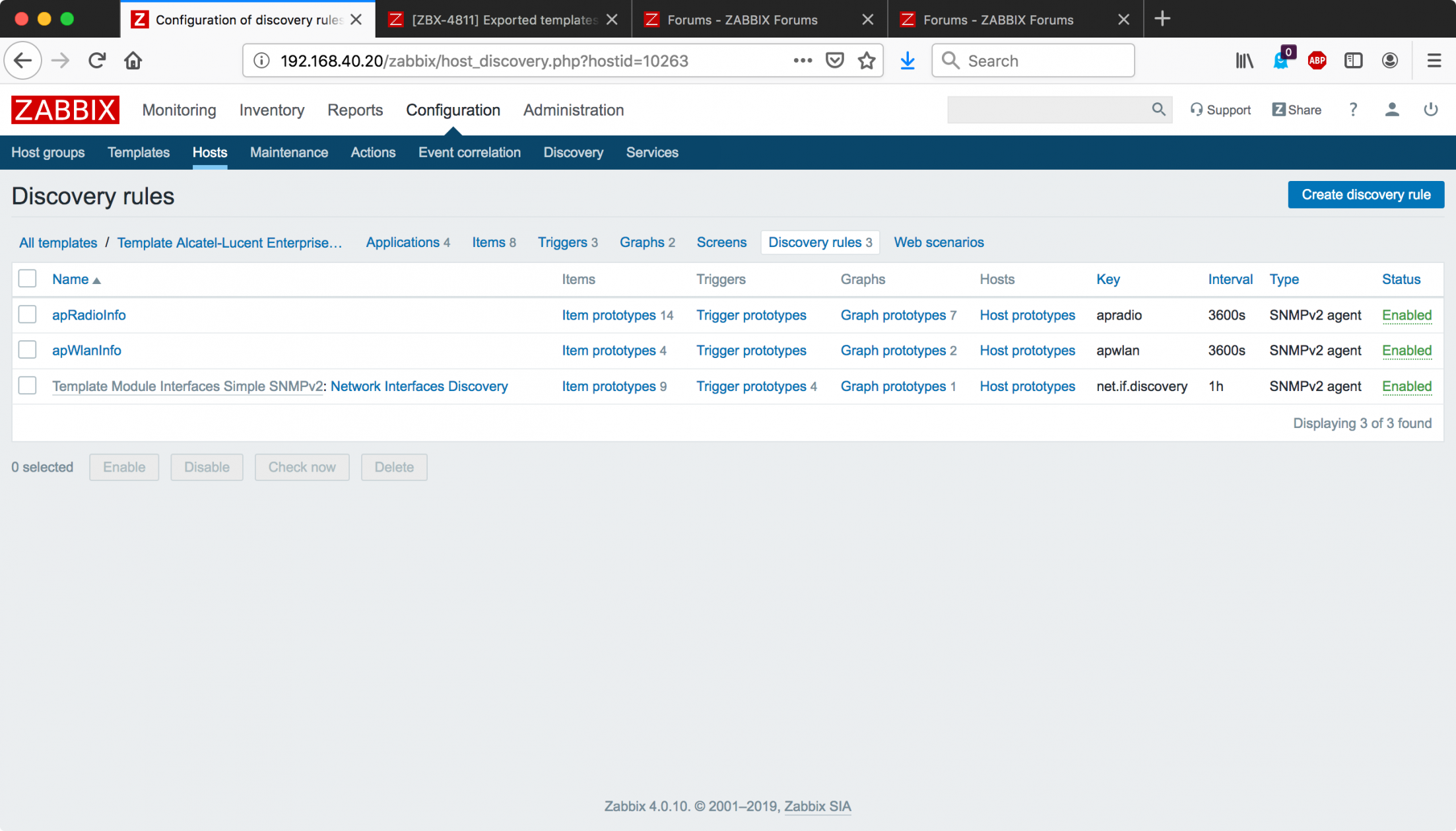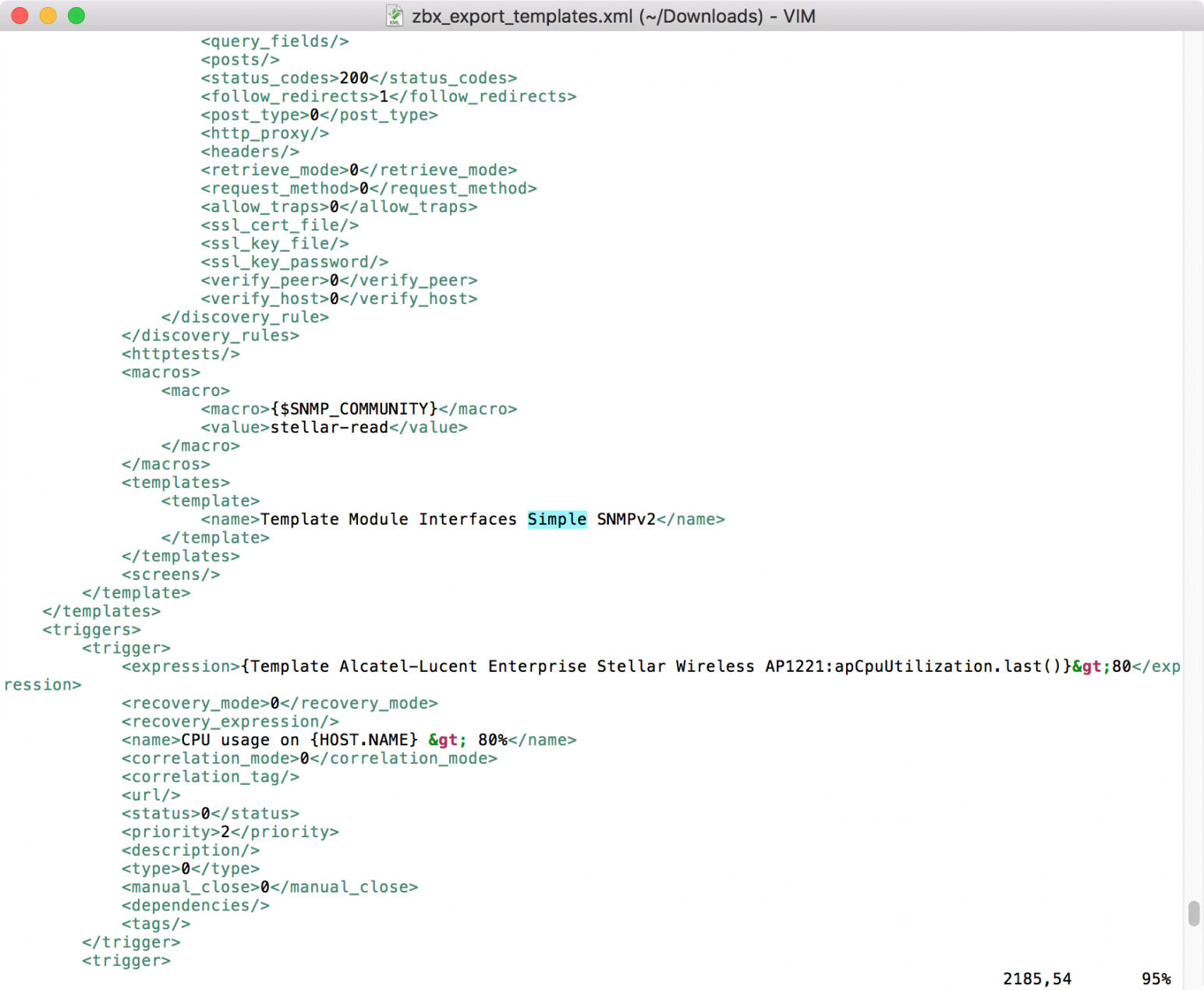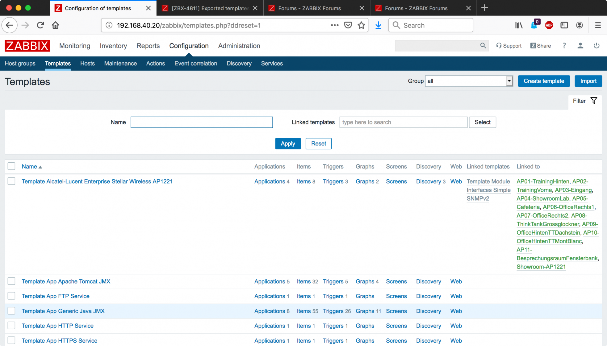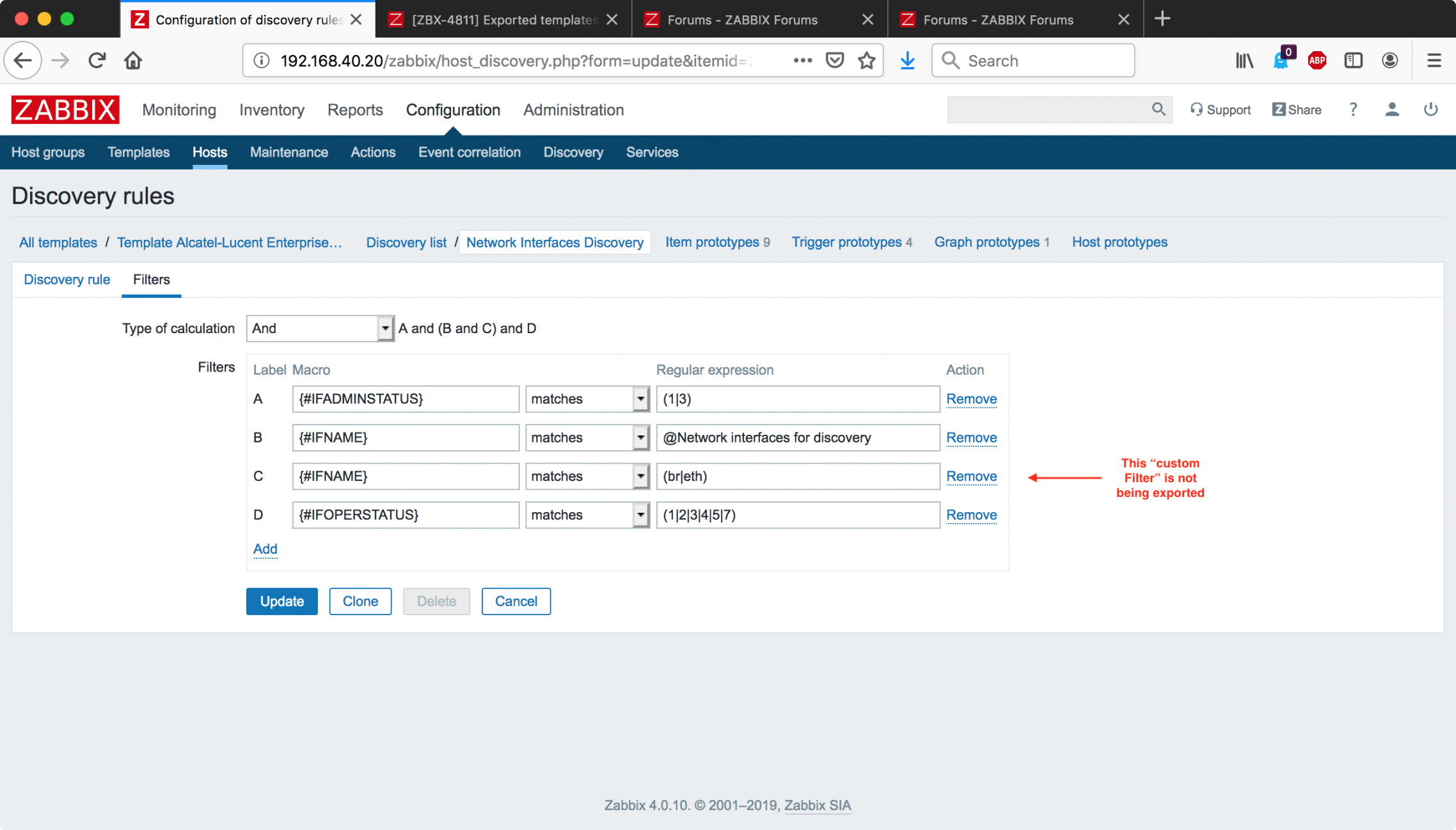 I built a number of Zabbix templates lately for Alcatel-Lucent Enterprise OmniSwitch and very recently our Stellar Wireless APs (full-disclosure: I work for ALE). I noticed that, when you leverage a linked template like "Template Module Interfaces Simple SNMPv2", the filter that you specify there (on the linked-discovery-rule) is not exported when I export the template to post it on https://share.zabbix.com