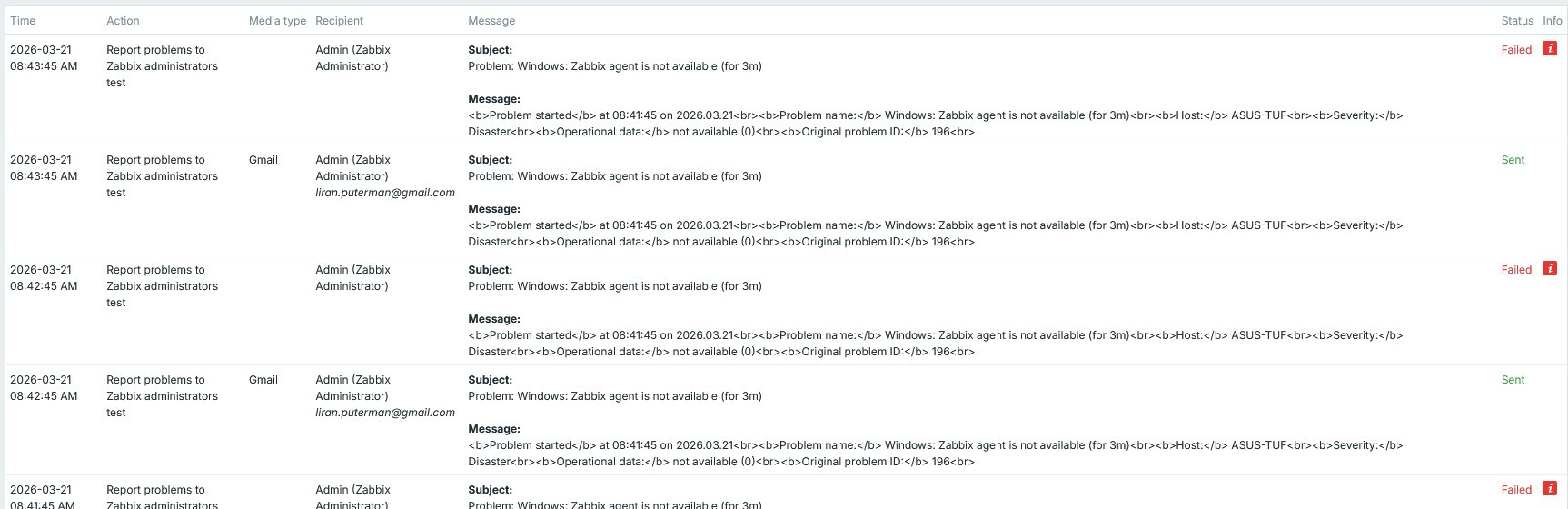 i sometimes have a problem in actions that email if failed and alerts do not send.