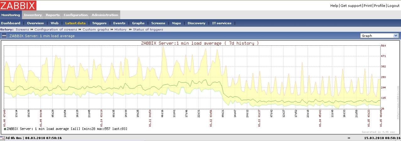I've been fighting with Zabbix being very slow, so slow that it might take 30-60 seconds to refresh a screen, for several months now since I added some new switches. My load average was high but the web server was working fine. I don't know beans about Mysql but I suspected that's where the problem was. I found on this thread a posting of a sample Mysql config file and it made all the difference in the world! I had the syntax wrong on a couple of lines like the innoDB_buffer_pool_size so it was using the default which is way too small for my system. I have 4 gigs of ram so I changed it to 2gigs and it made an unbelievable difference! I'll attach a screenshot of my cpu utilization on my Zabbix server, now I can have several Zabbix screens open and it doesn't change the performance at all. Several other people are also using it now that it's not painful to use.