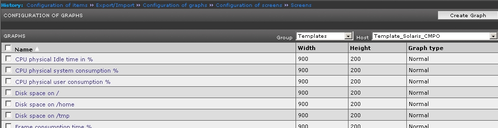I wanted to use graphs in my screens dynamically, so I imported them and then copied them to my template. In this case, this is a template I have created for my Solaris servers, so I have copied the graphs to it.