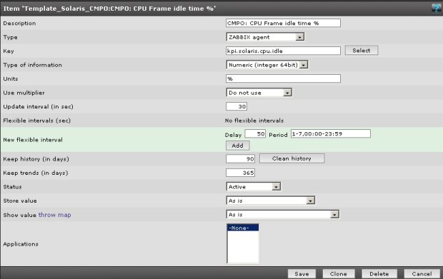 Then on the Zabbix server GUI, go to Configuration --> Items and select the host that you are setting this up for. Create a new item and make it look like the below screenshot. Do this for each item above and change the key as appropriate. You should then be able to produce graphs for CPU idle time, user time, System time and wio. basically it all comes down to the Zabbix admin adding in his own unique userparameters to the zabbix conf file.