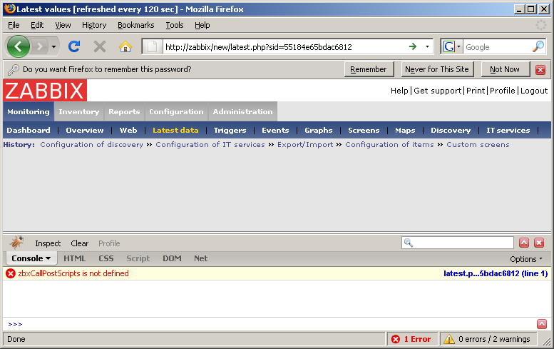 In new Zabbix 1.6.4 Monitoring > Latest data page breaks with an javascript error "zbxCallPostScripts is not defined".