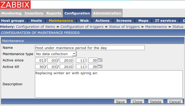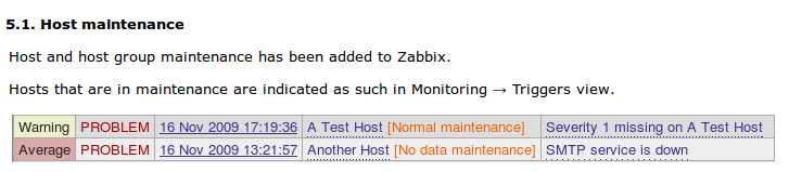 I setup a a host to be in a maintenance period, stopped the agent on the host. Unfortunately the "Triggers" page doesn't report it being down for a maintenance period. Instead, it reports it with the standard "Server unreachable" trigger. The Zabbix documentation says that the trigger page should report a active maintenance period (second image below) along side the trigger that is active. Did I missing something?