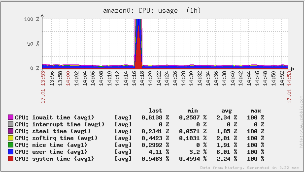 As you can see, all metrics except interrupt sometimes (often on :00 minutes, but not always) jumps to 100. I've catched the moment, top during that jump reported normal values (0-5%).