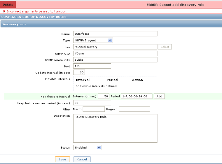Now, adding the discovery rule to the template, I'm receiving "ERROR: Cannot add discovery rule" - see attached screenshot.