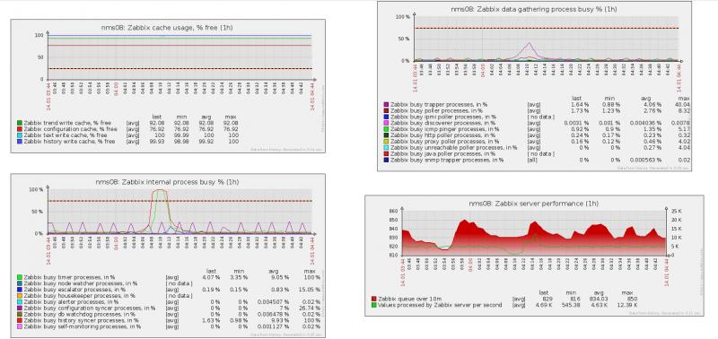 I have been experiencing a strange occurrence and no matter what I do, it happens. Every hour at 8 minutes after the hour, the db syncers and timer process rise to 100% and stay there for about 4 minutes. This used to cause the queue to rise to high amounts, but we migrated the database to it's own server with more I/O to resolve this issue. I have researched the forums and adjusted the trappers and pollers, etc to make suer they are not the issue. The issue is that when the db syncers increase to 100% and the database stops processing the queue. I can't figure out which actually happens first, if the database is causing the db syncers to go up or if the db synchers going up causing the database to hang.