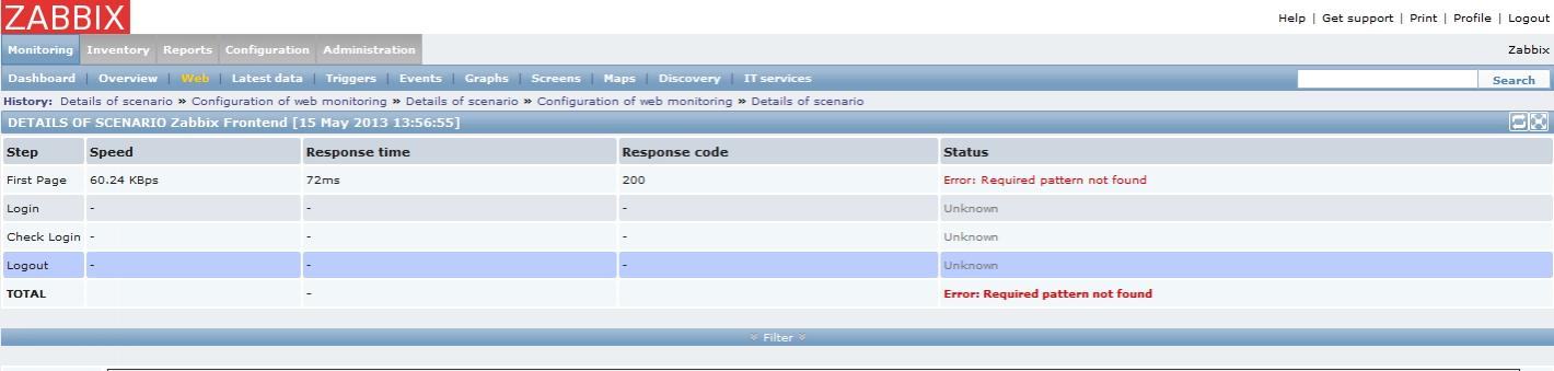 I am trying to setup web monitoring in zabbix 2.0.6 as per zabbix documentation with real time scenario. I have set it up exactly same way as described in doc but i am receiving error in first step " Error: Required pattern not found". Can anyone tell me how to trouble shoot this kind of errors?