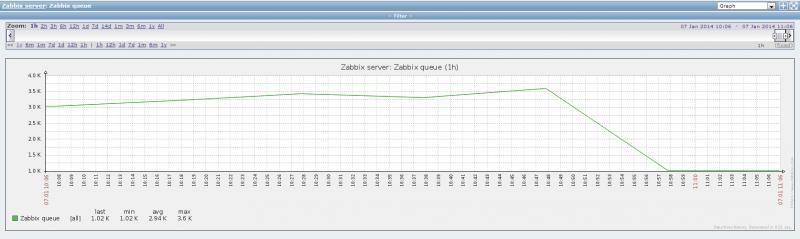 my detailed queue reports I have an item "mem Heap Memory max" (update interval 3600 seconds) delayed by "56m 51s", Zabbix reports it should've been checked on "05 Mar 2014 17:00:04", so let's check the real "Last check" date reported on the "latest data" for that item: "05 Mar 2014 17:00:01" (3 seconds before the expected last check).