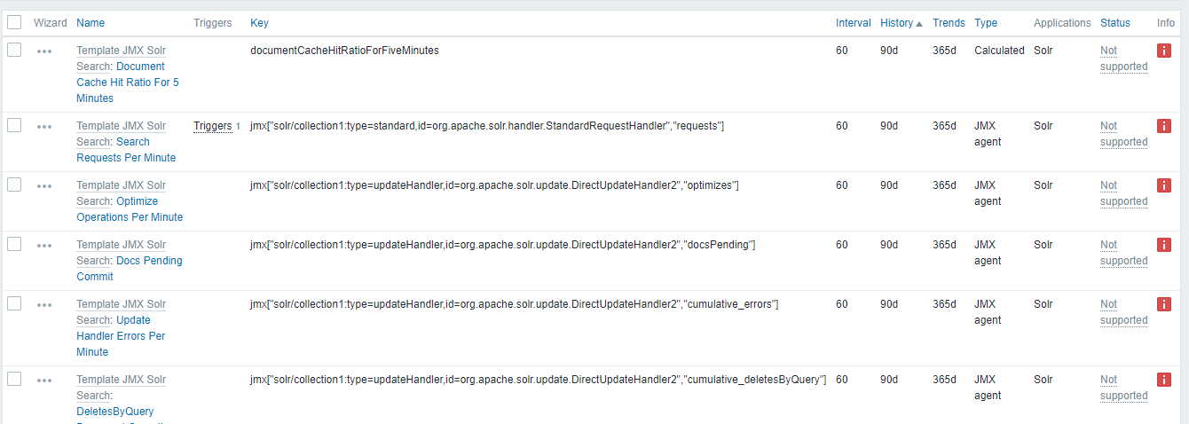 I am not able to monitor apache solr in my server, all of the items in solr are not supported status,