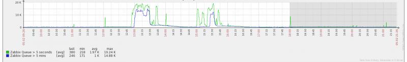 1)Sometimes the items in queues will accumulate to a high number and on the UI it will say the zabbix server is not running. Sometimes it won't happen for weeks, but it happened twice today, which are obvious on the graphs below.
