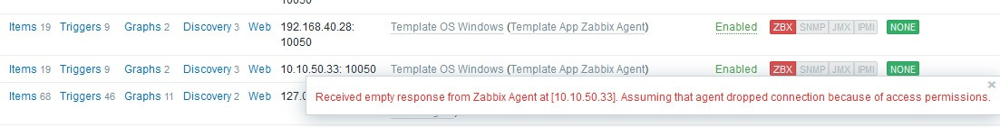 (Received empty response from Zabbix Agent at Assuming that agent dropped connection because of access permissions.)
