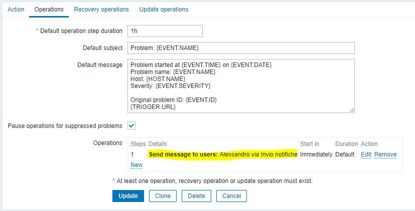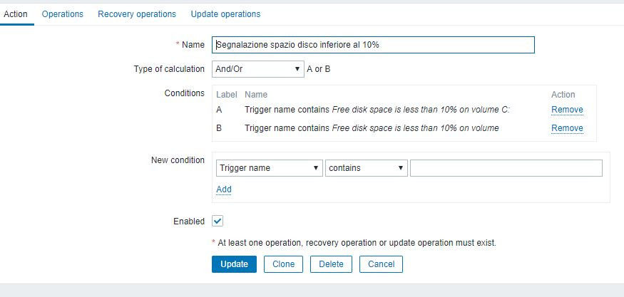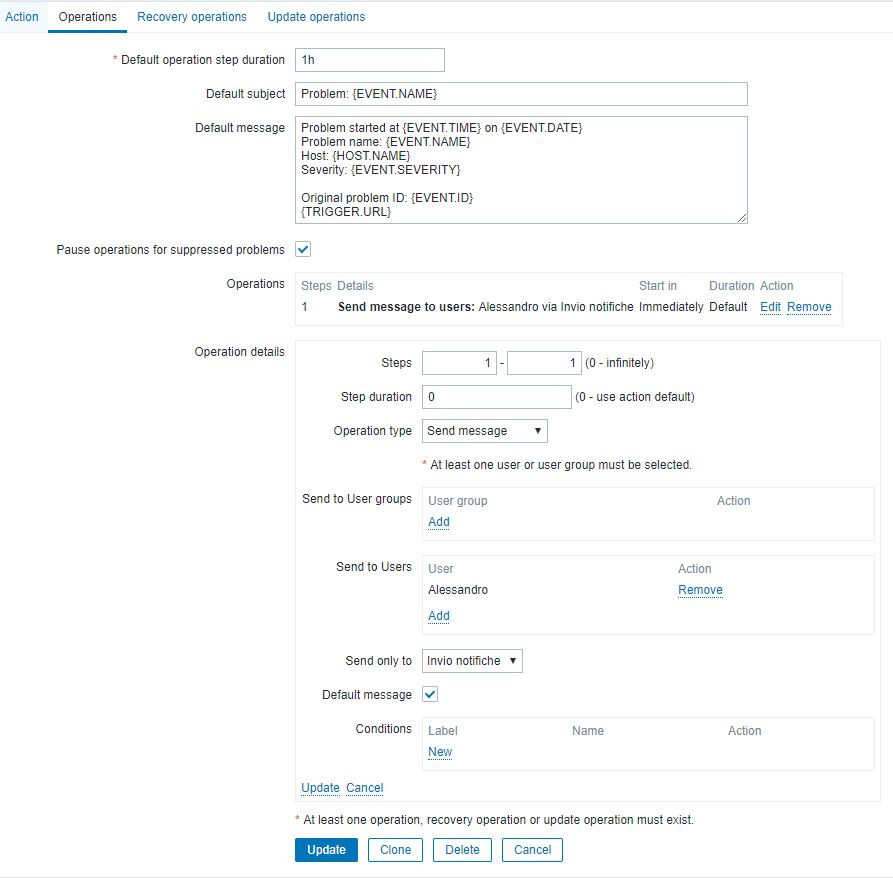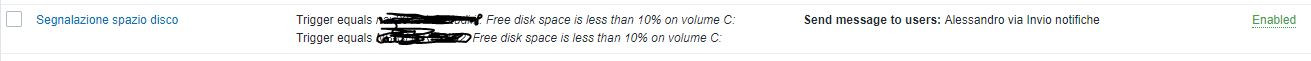 I need to set up an email notification when the disk space goes below 10% for the servers in a group. I configured the user with the email, I configured the item and the trigger (both are prototypes), but I can't get actions to send the email when the event occurs. I don't understand what I'm wrong.