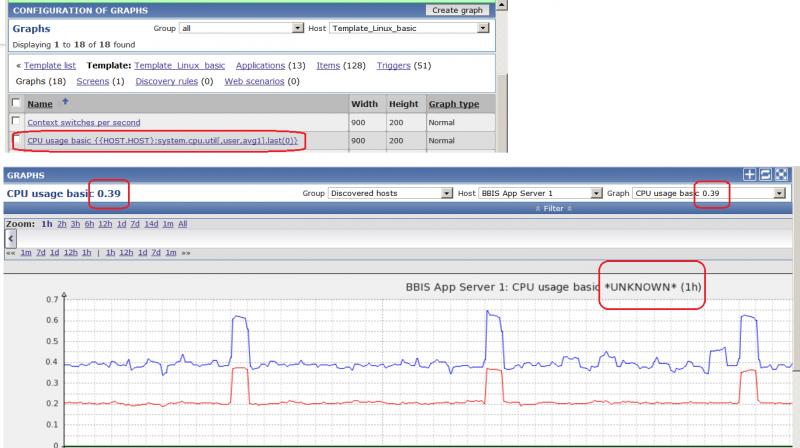 I'm trying to attach hostname to the graph name, it seems to be partially working. In the attached pic, you can see the graph name ("CPU usage basic {{HOST.HOST}:system.cpu.util[,user,avg1].last(0)}") and it's effect on the graph page, where 2 out of 3 places where I see the name of the graph shows correct value but THE place I want to see it correctly, it shows "*UNKNOWN*".