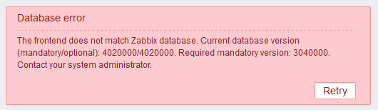The frontend does not match Zabbix database. Current database version (mandatory/optional): 4020000/4020000. Required mandatory version: 3040000. Contact your system administrator.