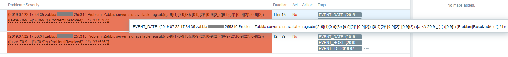 2019.07.22 09:37:29 some.host.com 255316 Problem: Zabbix server unavailable