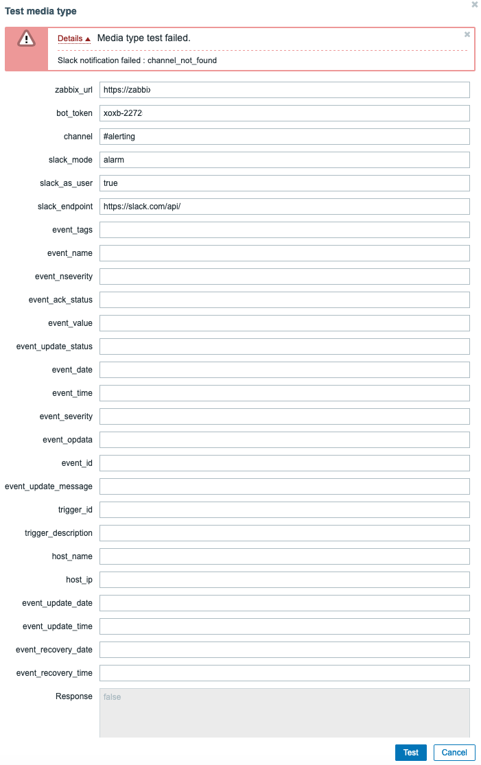 I am running a fresh installation of CentOS 8, and Installed Zabbix 4.4.7. I tried to use the new Slack Webhook that comes with 4.4.7, using the bot_token, however Zabbix is having an issue.