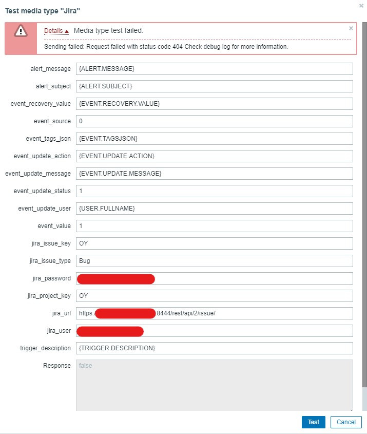 I'm getting 404 error like below while testing Zabbix 5.0 Jira Webhook. I attached my configurations.