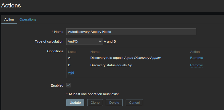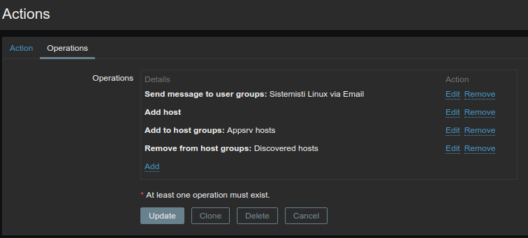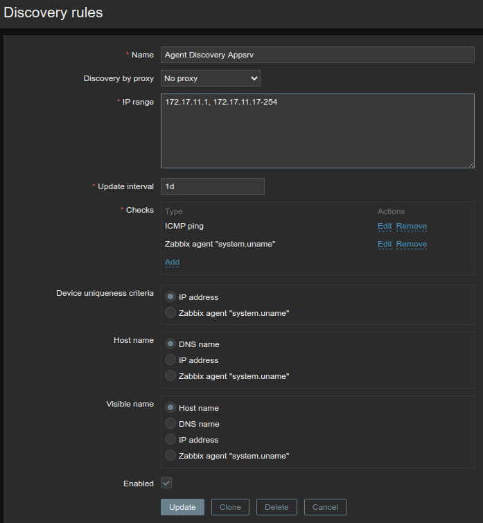 I wrote a rule whose purpose is to check an IP range and add to a specific group the hosts that respond to some checks (Discovery status equals Up and Zabbix agent "system.uname") and eventually send a custom notification message.