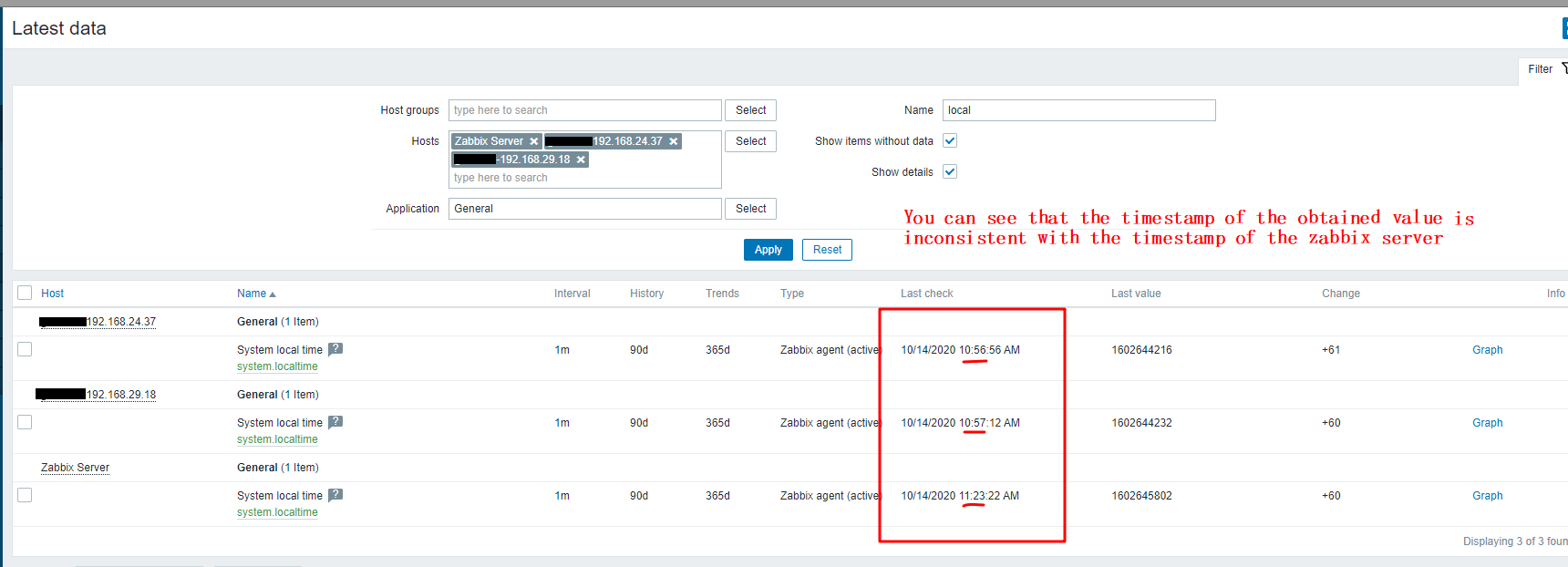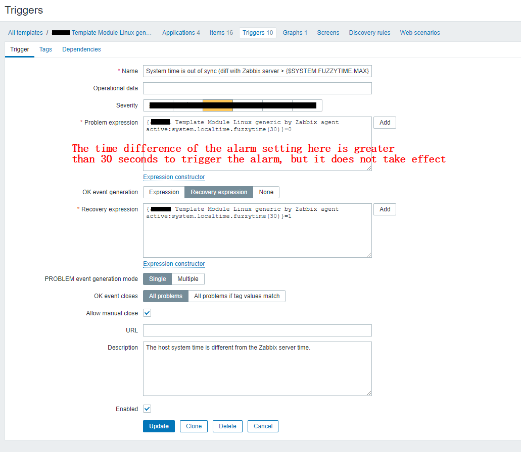 Use the default key value monitoring: [system.localtime], you can get the time information of the agent. After deliberately set to the wrong time, the trigger should give an alarm, but no prompt information appears. All configurations are adopted The system default configuration items, what should I do? Please see the attachment for detailed configuration