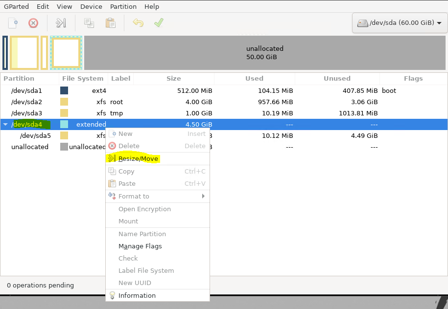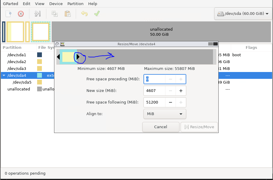 2- right click on mouse on /dev/sda4 : >> choose Resize/Move "see pic 1 "