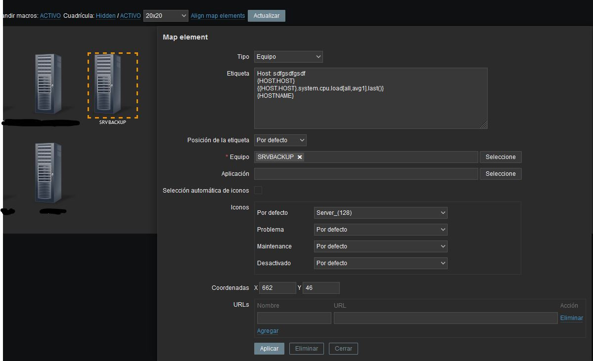 I'm trying to customize my host map with a personal label but it is not working correctly. It seems to only apply the hostname from the host and not using macros or strings.