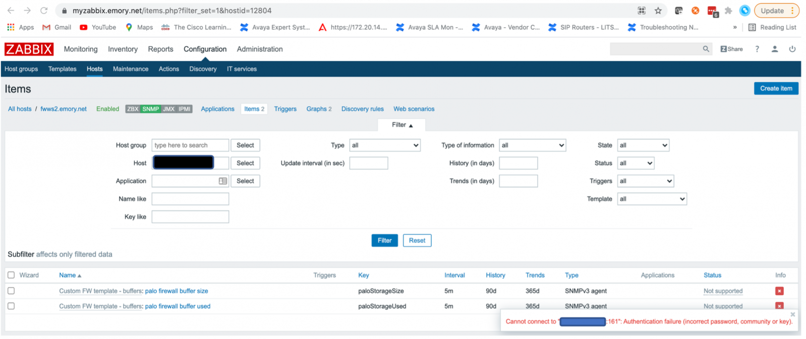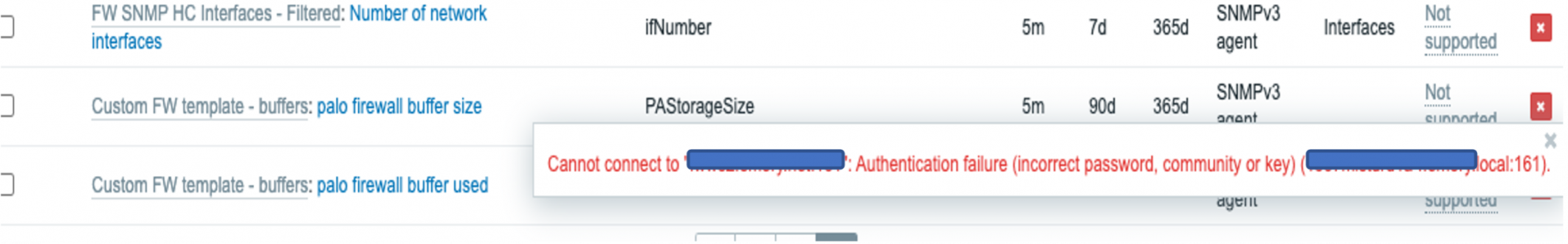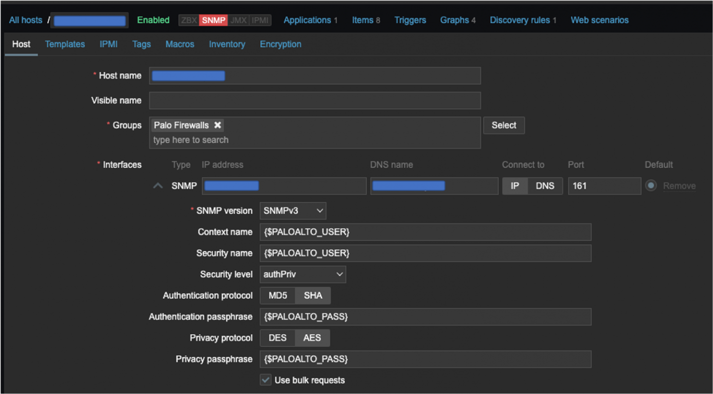 I have a couple of PA-7050 firewalls that I monitor from Solarwinds Orion via snmp v3. However, when I try to monitor those same devices via Zabbix (SNMP v3), I am unable to get an SNMP response via the Zabbix application. SNMPwalk works fine from the command line on the zabbix server. Seems to happen on Zabbix version 5 and version 3. Has anyone else had this experience or have a suggestion on places to look for a solution?