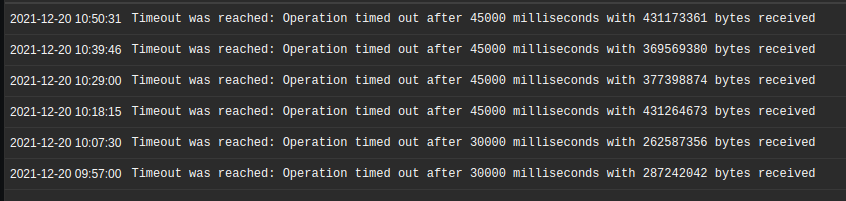 We require the monitoring of an API endpoint that can sometimes have a relatively large payload (500MB+) for performance reasons. When accessed with a curl command from the zabbix server it takes under 20-30 seconds to download. However, the web scenario step for the same endpoint consistently times out with a timeout setting as high as 45 seconds (see attached).