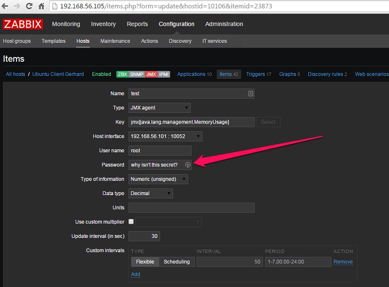 I'm not sure if someone already noticed this... I created a new item in one of my hosts and because it was a JMX connection I wanted to enter my user credentials. After entering my username I went to the password field and I was a bit shocked to see my password isn't changed to stars or little dots so that others can't view what I'm typing.