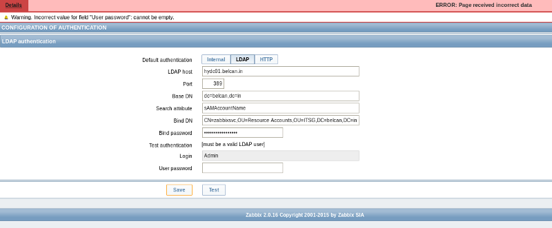 I'm trying to configure the LDAP authentication, but I keep getting "Warning. Incorrect value for field "User password": cannot be empty." even though I have populated the password field!