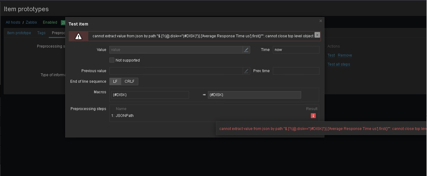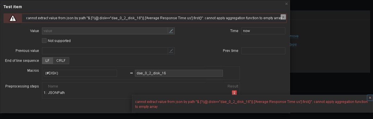 When you test, give also value to macro ... replace that {#DISK} there with real value from data (like dae_0_2_disk_16), so you can compare, that correct thing will be extracted. I also don't see anything entered into "value" field during testing... ? You need to feed it with proper json...
