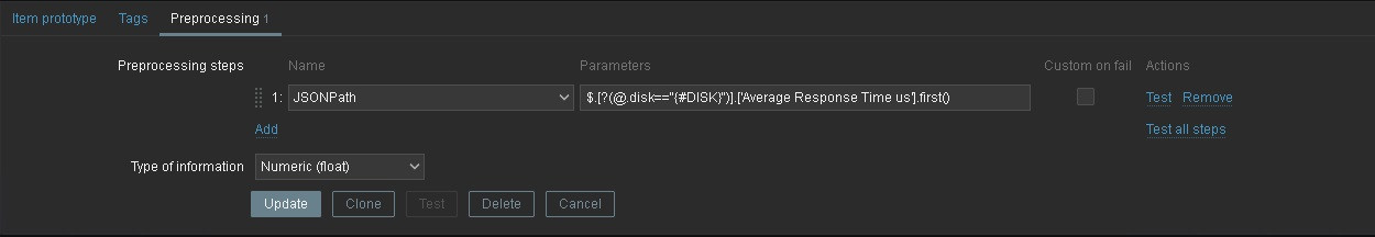 Add item prototype to discovery, Type of information -> float. Set its type as "dependent item" and point master item to the item that retrieves your data. (yes the same as in discovery). Add preprocessing "JSONPath -> $.[?(@.disk=="{#DISK}")].['Average Response Time us'].first()"