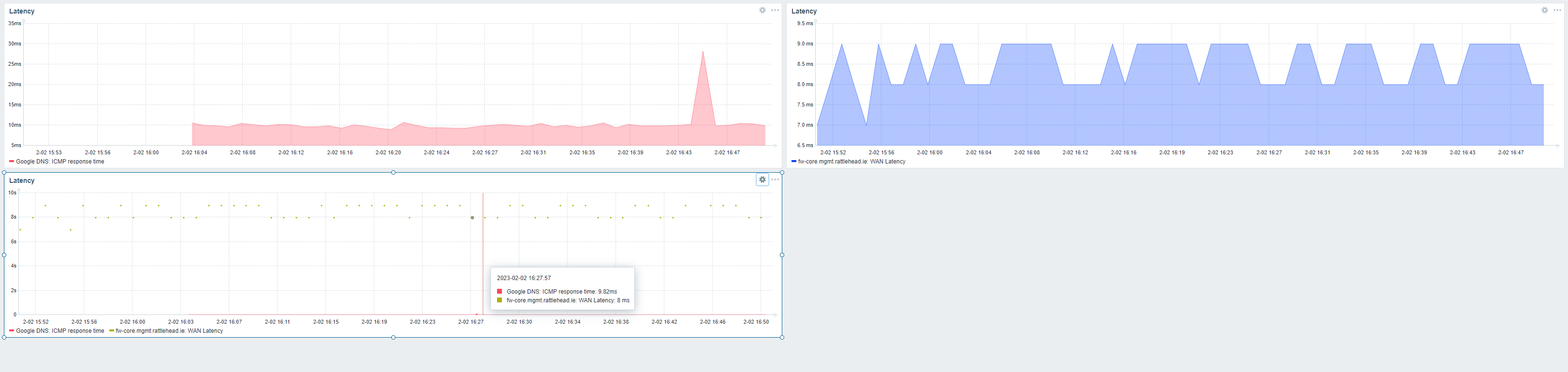 Just to be clear and upfront the 2 different devices are using different templates to get these. The fw using UniFi template and the Google DNS using the ICMP Ping template.