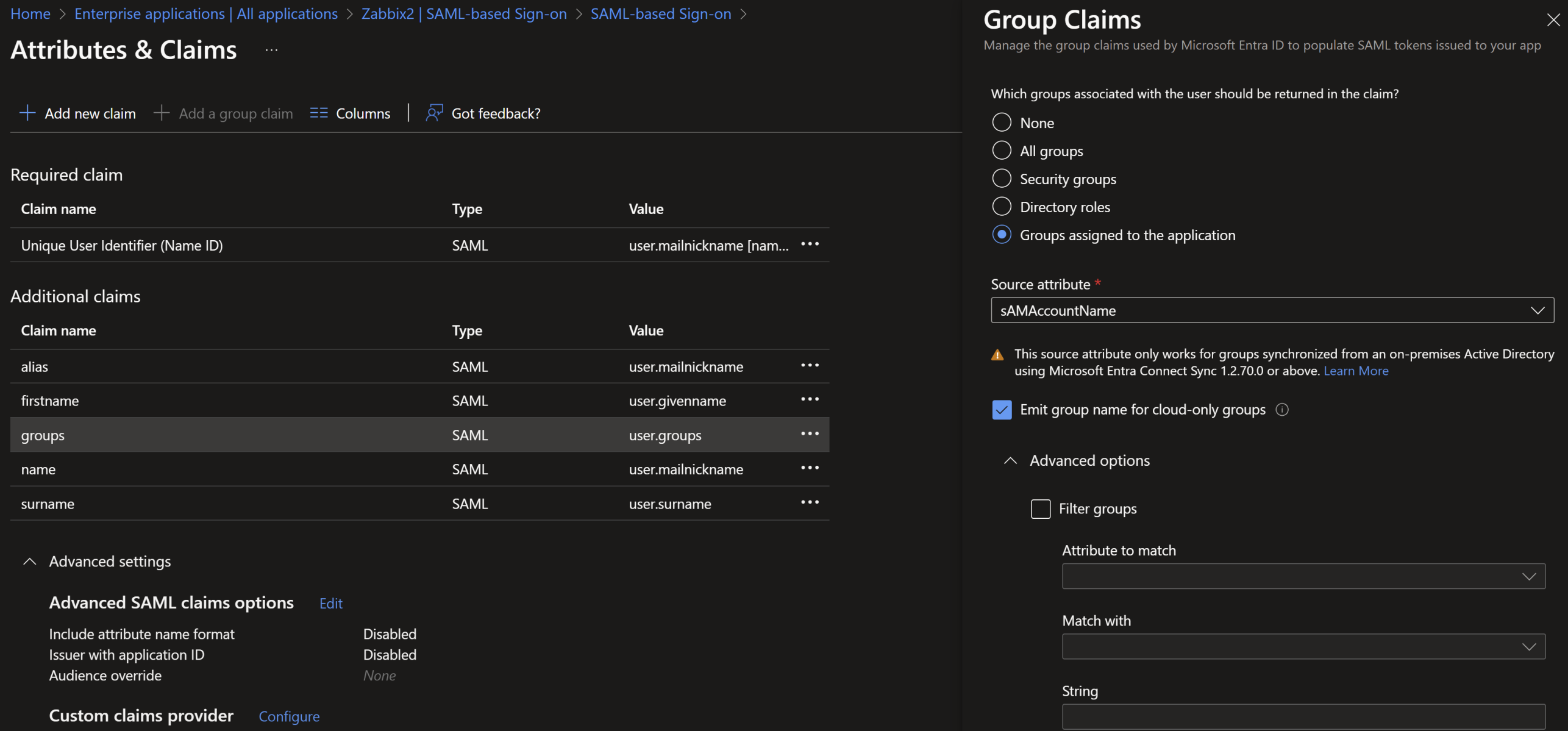 • Checked "Customize the name of the group claim" > Set to "memberOf"