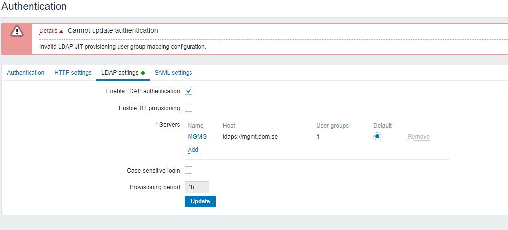 Invalid LDAP JIT provisioning user group mapping configuration."