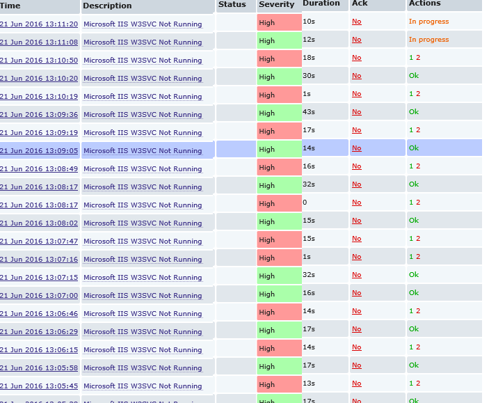 I've been having an issue with our zabbix popping up alerts for an iis web server fault "Microsoft IIS W3SVC Not Running". This shows up every 15 seconds or so, and usually lasts about 2-30 seconds before disappearing.