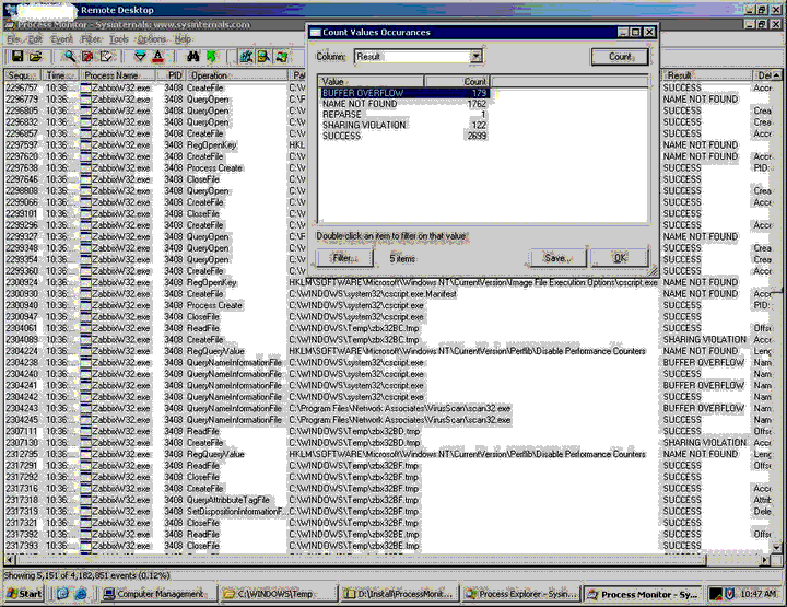 When looking in the temp directory on this machine i saw that there were 62000+ zbxXXXX.tmp files in this directory. That is probably about the limit of files one can put in a directory on an NTFS filesystem.