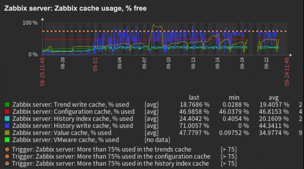 I have tuned some process numbers and memory sizes where it seemed related to me. But the problem is still there. I put the Zabbix server dashboard graphs here, maybe someone has some concrete advice, what parameters I should tune and in what direction.