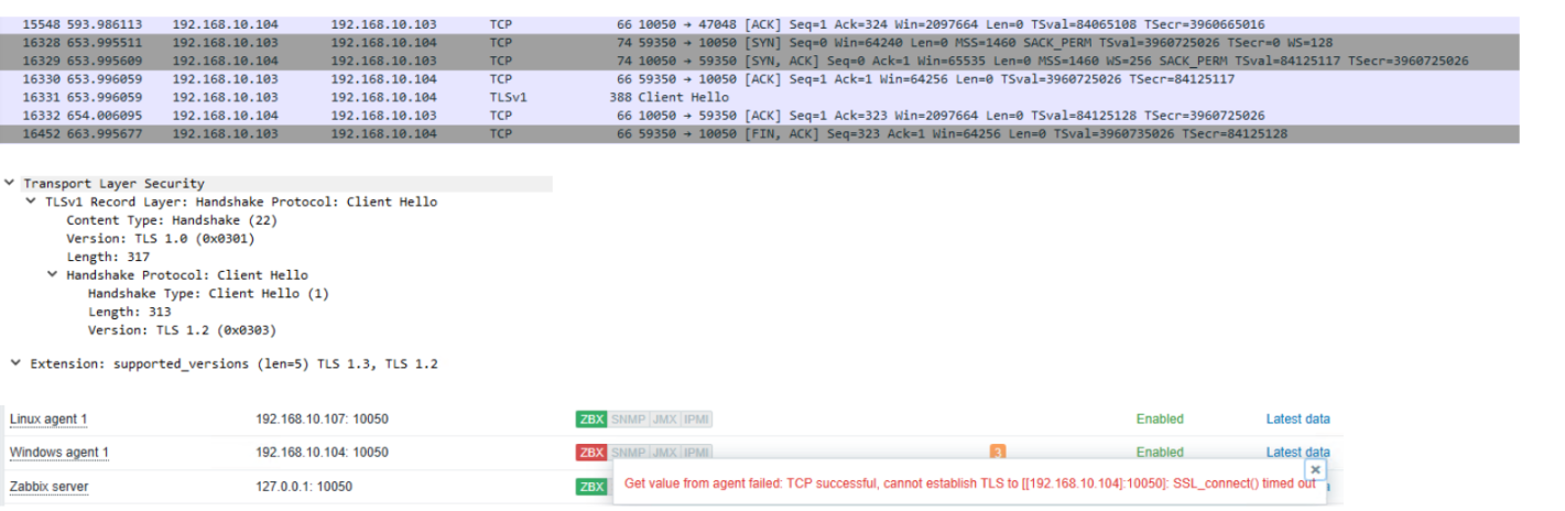 TCP handshake is ok, but not TLS (see picture below)Same error in server log, and on agents side C source code TLS functions seem to run again and again (=> connection timed out) and nothing happen after agent-side in the logs (agent freeze)