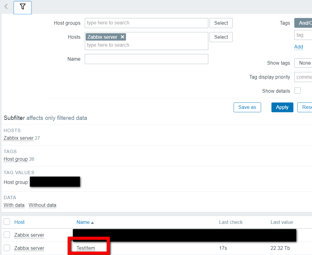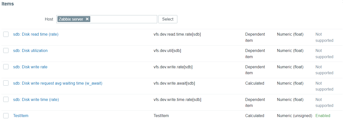 1. When I want to add it to a dashboard widget or enter the name into a filter, it does not get found / displayed. However when I click to show all items of a host, it is there and I can select it.