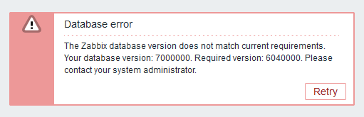 The Zabbix database version does not match current requirements. Your database version: 7000000. Required version: 6040000. Please contact your system administrator.