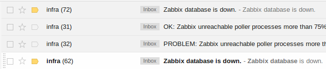 Last week I restarted zabbix server VM, I've got email alert in every hour, with information that Zabbix database is down. Im checked Mysql Database. but mysql still running, Im also checking the log zabbix server and mysql error log, but i cant found the error log messsage.