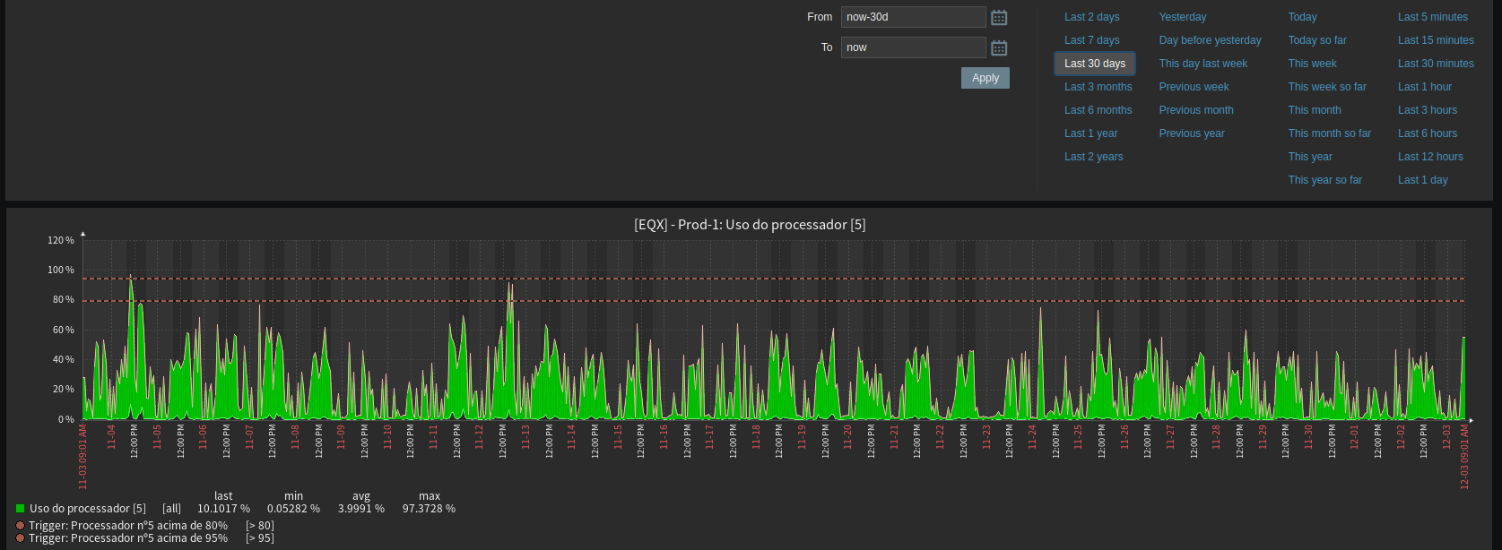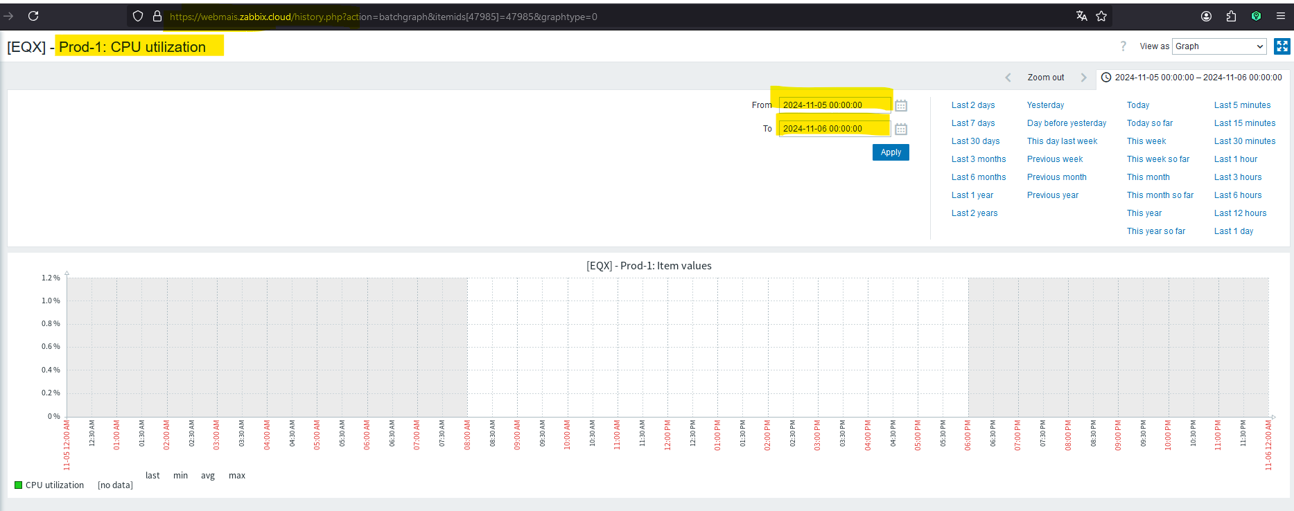 When consulting my items in zabbix and setting the default period of 30 days, zabbix displays the graph, but when selecting a specific day within these 30 days, the graph is displayed blank.